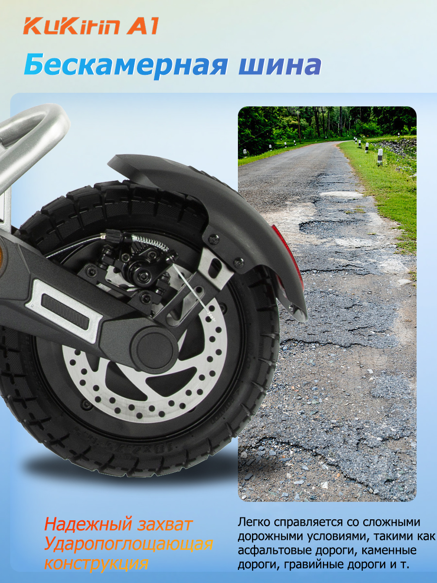 Колеса диаметром 10 дюймов с качественными покрышками гарантируют отличную устойчивость и комфортное преодоление стыков асфальта и мелких выбоин. Габаритные размеры в разложенном виде составляют 1154×580×1298 мм, создавая просторную платформу для уверенного положения водителя. Максимальная нагрузка достигает 120 кг, что позволяет использовать самокат большинству пользователей.