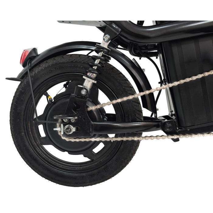 Задний электропривод мощностью 350 Вт питается от аккумулятора напряжением 48 В и емкостью 7800 мА·ч, обеспечивая максимальную скорость до 30 км/ч. Мощности двигателя достаточно для уверенного старта с места и преодоления городских подъемов без потери скорости.